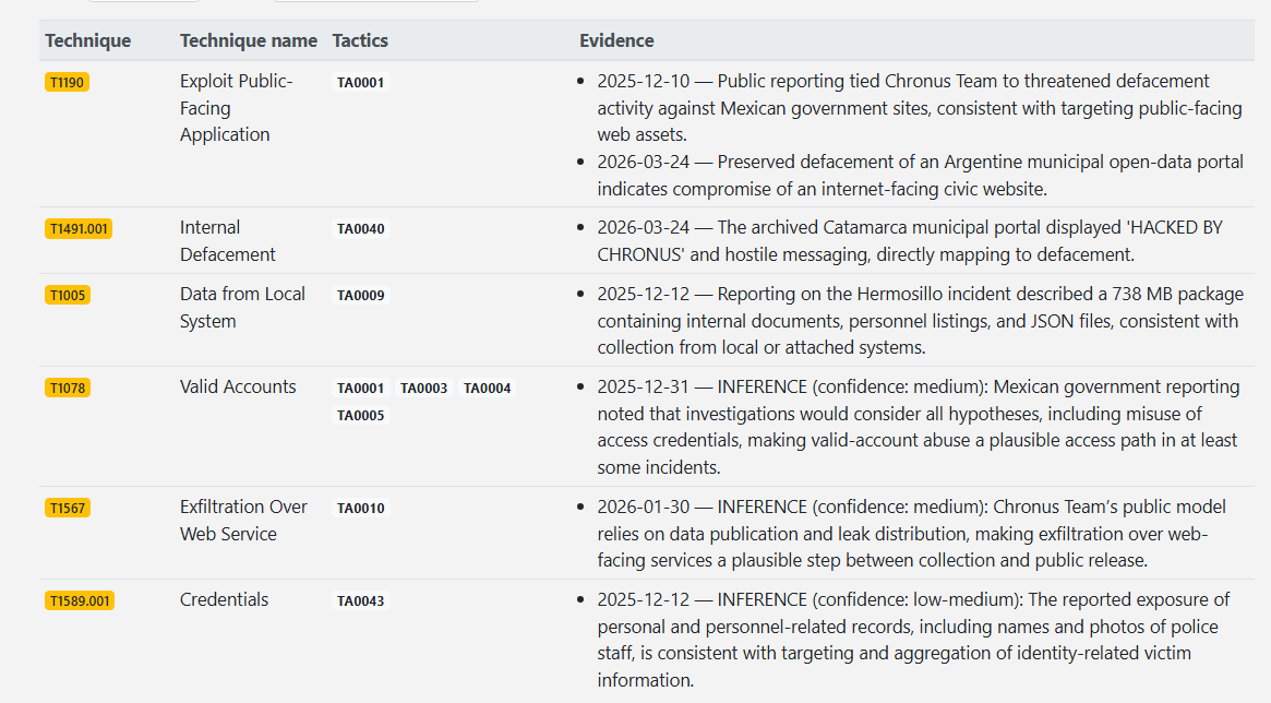 Mapeo técnico de Chronus Team. Relación entre técnicas observadas o inferidas y evidencia OSINT preservada, incluyendo explotación de aplicaciones públicas, defacement, recolección local, abuso potencial de cuentas válidas y exfiltración para publicación.