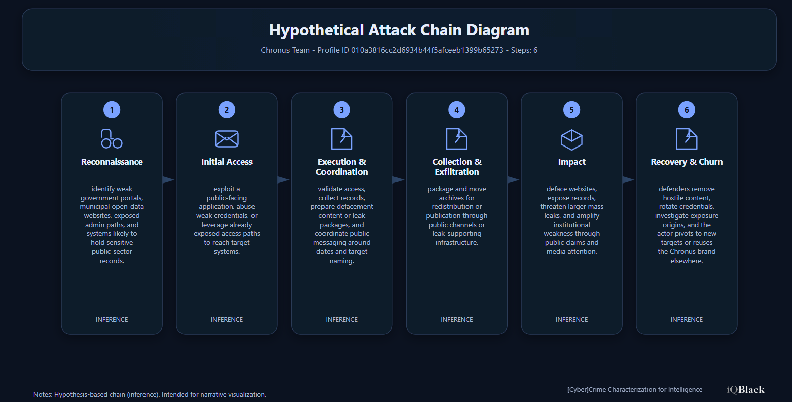 Cadena de ataque hipotética de Chronus Team. Visualización inferencial del flujo operativo más probable del actor, desde el reconocimiento de portales públicos vulnerables hasta la filtración, defacement y rotación hacia nuevos objetivos bajo la misma marca.