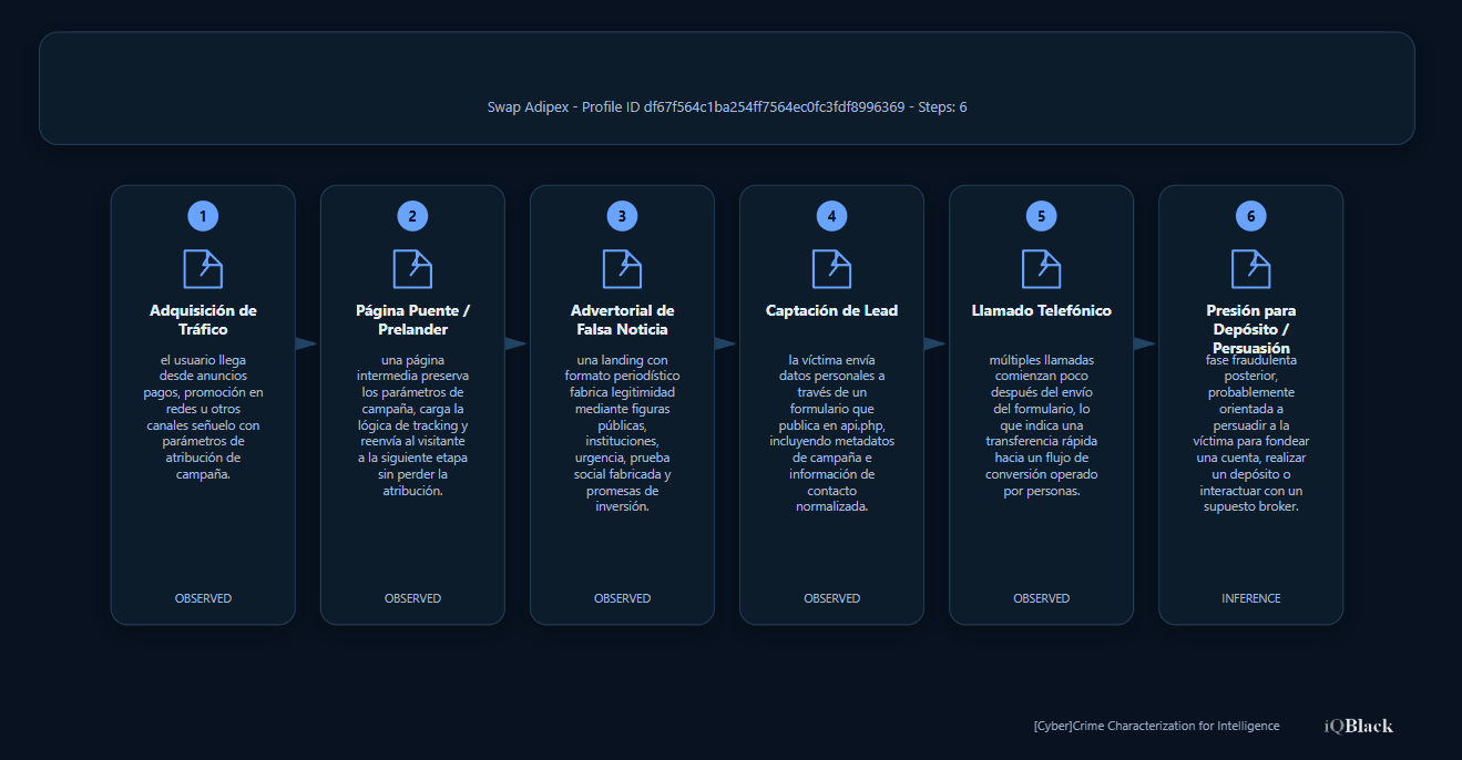Los casos de “Swap Adipex AI” analizados hasta el momento no exhiben comportamiento clásico de malware del lado del navegador. En cambio, revelan un funnel de fraude de inversión estructurado, que combina páginas puente, landings temáticas con formato de noticia falsa, lógica de atribución publicitaria, formularios de captación y un seguimiento telefónico rápido tras el envío de datos.