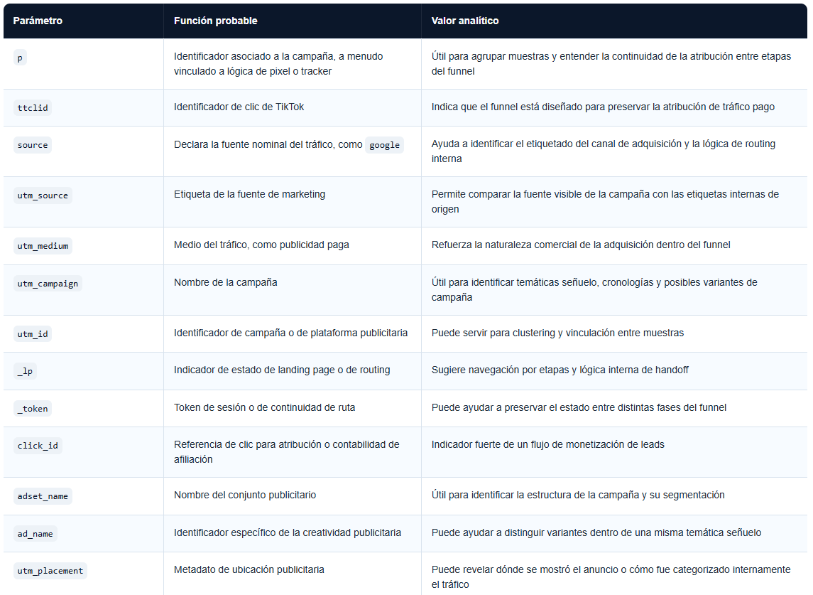 Para defensores e investigadores, la lección es clara: no toda infraestructura web dañina debe entenderse a través del lente del malware. Algunas operaciones se modelan mejor como deceptive web funnels, donde el código existe para preservar valor del tráfico, mejorar calidad del lead y optimizar la entrega de la víctima a una fase posterior.