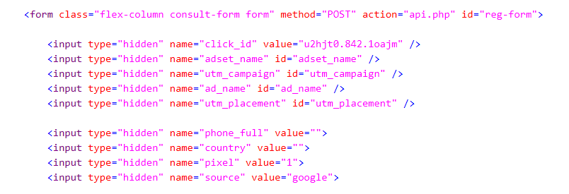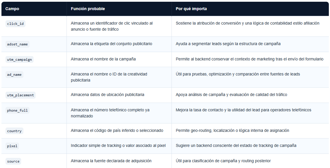 El formulario es particularmente revelador. Publica vía POST a api.php e incluye tanto campos visibles ingresados por el usuario como campos ocultos de campaña y normalización, como click_id, utm_campaign, ad_name, phone_full, country, pixel y source. Esto es infraestructura de captación, atribución y routing.