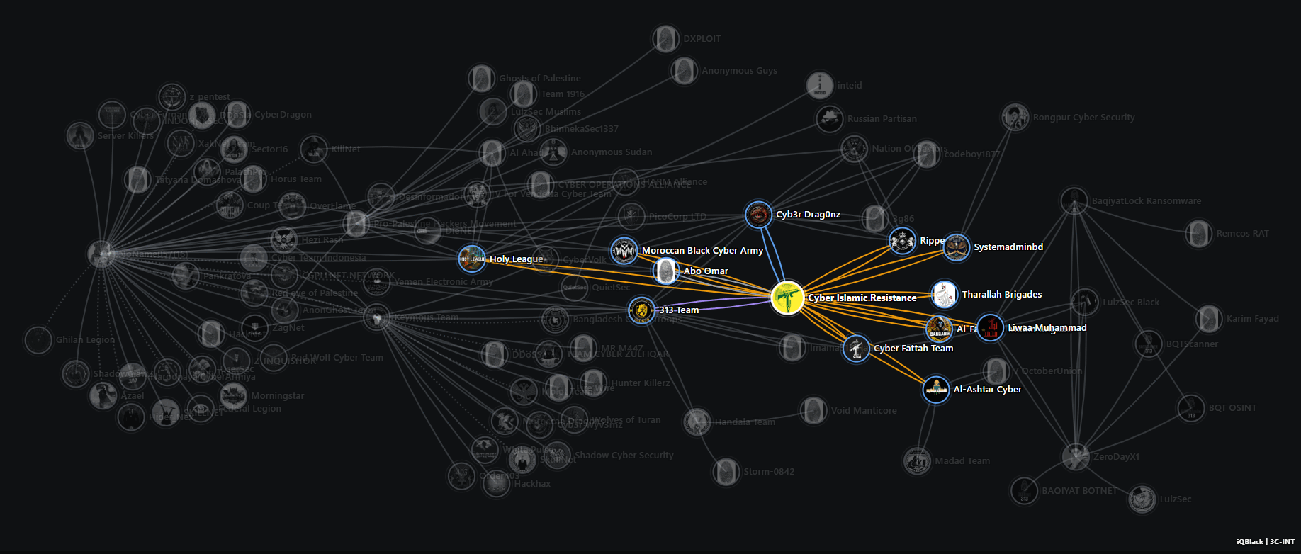 Expanded map of public relationships and visible affinities around Cyber Islamic Resistance, Holy League, and other nodes within the aligned hacktivist ecosystem.