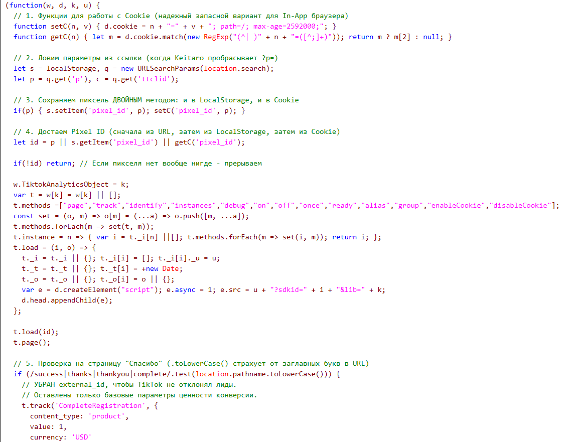 The smaller HTML sample is operationally simple but analytically very important. It includes TikTok Pixel logic, stores identifiers in both localStorage and cookies, extracts values such as p and ttclid from the query string, and rewrites target links to preserve campaign parameters.