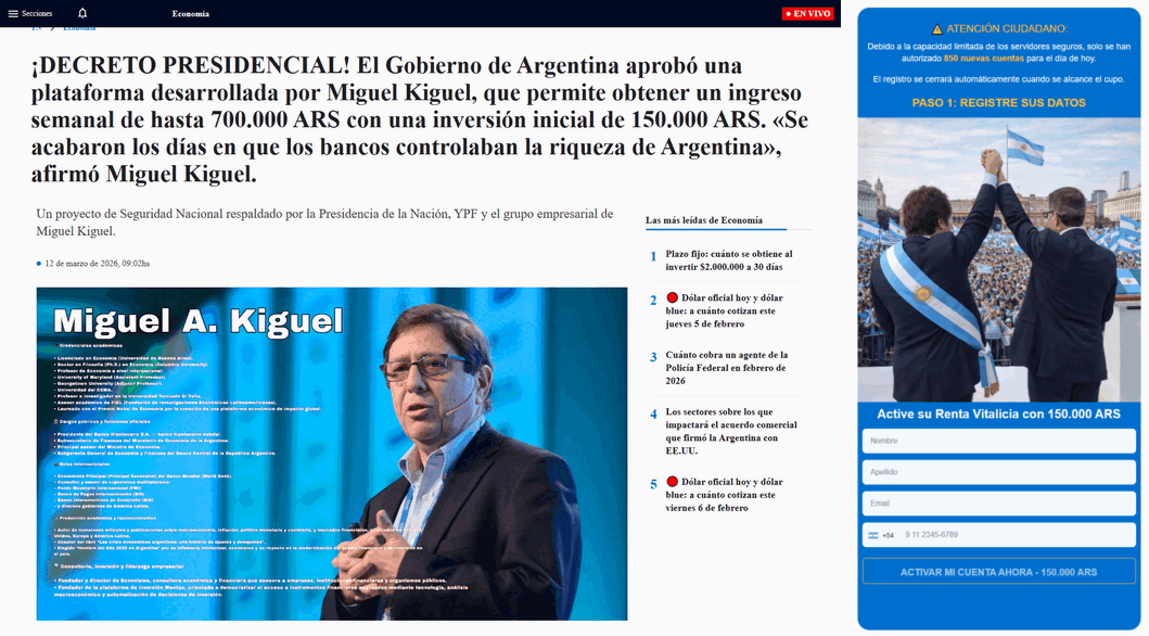 The longer landing page plays a different role. Its purpose is to build trust quickly and push the visitor toward form submission. The page imitates a legitimate news layout, invokes Argentine political and economic figures, references state institutions and major companies, and presents “Swap Adipex AI” as a government-backed or nationally relevant investment opportunity.