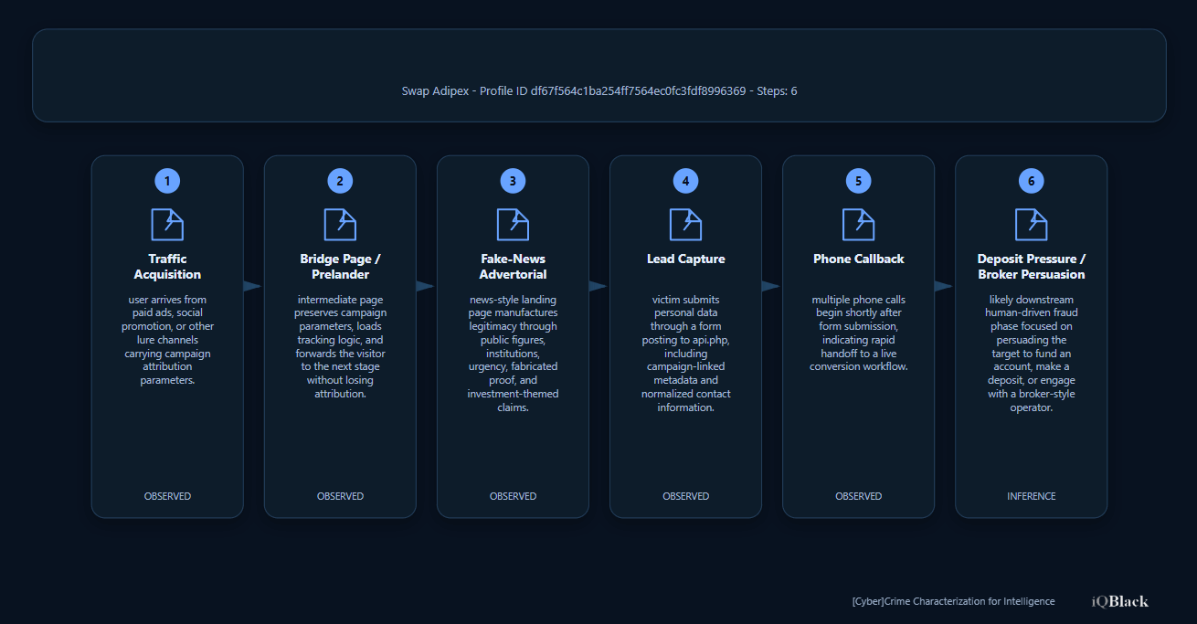 The “Swap Adipex AI” cases reviewed so far point to a structured investment scam workflow built on fake-news styling, bridge-page attribution logic, form-based lead capture, and fast phone-based conversion. There is currently no strong evidence of classic browser-side malware. There is, however, strong evidence of a coordinated deception stack designed to move a victim from ad click to human exploitation with minimal friction.