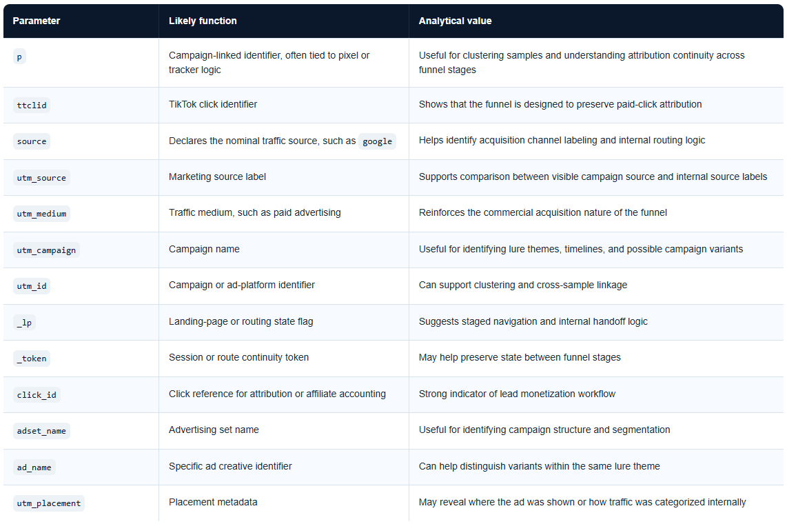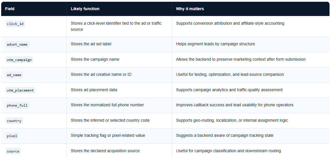 This is not a trivial distinction. The scam is not concentrated in one page or one script. Instead, different stages perform different jobs. One stage receives and preserves campaign data. Another manufactures legitimacy. Another captures the lead. And the next observed stage appears to move into live, human-driven conversion.